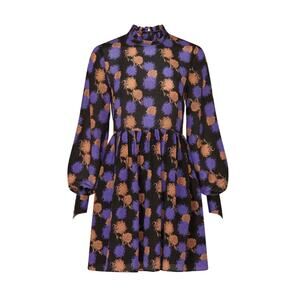 Black printed silk (100% Silk). Hourglass. Long sleeves. High neckline. Front pockets. Hidden back zipper closure.
