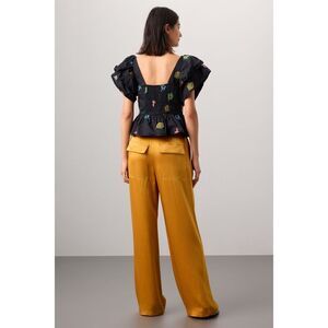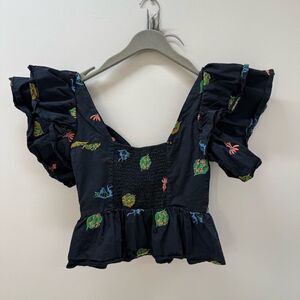 Black cotton (100% Organic Cotton). Embroidery thread (100% Polyester). Top. Sweetheart neckline. Short sleeves. Pull-on.