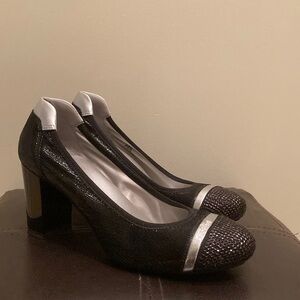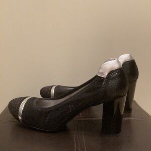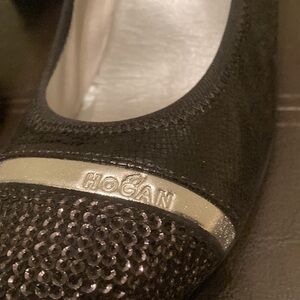 Size EU36.5 Hogan black leather and sequin block heels. Silver detail w/logo across the vamp. Rounded toe.