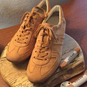 Hogan smooth leather sneakers circa early 2000’s, purchased in Aspen. In very good condition, fully leather lined. These have a raised heel inside, more comfortable than a flat shoe and little extra height too:) size 6.5. Make me an offer:)