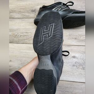 Step out in style with our Hogan Sneakers in black, featuring eye-catching metallic accents. These sneakers are the perfect blend of fashion and functionality, designed to elevate any outfit. With their high arch look, they not only provide great support and comfort but also add a touch of elegance to your overall look. Whether you're running errands or going out for a casual night on the town, these sleek and stylish sneakers are guaranteed to turn heads. Step up your shoe game with the Hogan Sneakers and make a fashion statement wherever you go. size 36 1/2 (us 6.5) good condition no damage inside heel and the wearing on the inside sole is just fading of the color, not uncomfortable.