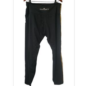 Comfortable, athletic wear leggings featuring the four Hogwarts house icons on the lower left pant leg, striped house colors down the right, and "Hogwarts" centered on the upper back. Design is screen printed on lightweight, form-fitting black fabric with a hidden interior pocket on the waistband.