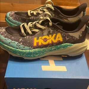 Brand new still in box Dynamic Hoka trail shoes in black and teal. Features bold yellow and pink logo accents. Great for everyday wear as well