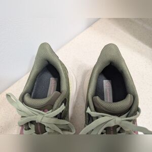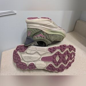 the most comfortable shoes for running on trails, dirt roads, pavement or mixed routes! good used condition. only took them on a few runs, size wasn't quite right for me. (these feel more like a 7.5 because the flexible fabric) green with pink super cute!