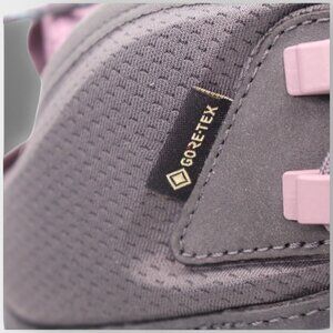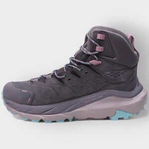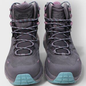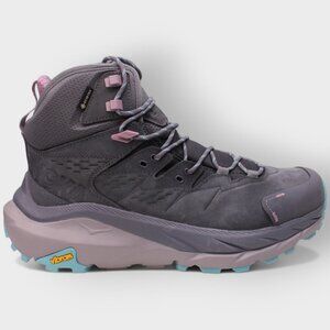 Stylish Hoka athletic shoes. Features gray upper with pink accents. Durable and comfortable design.