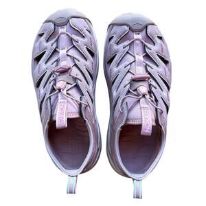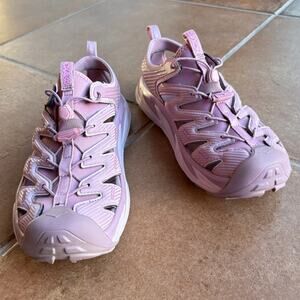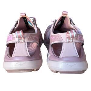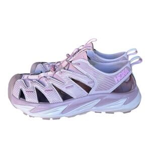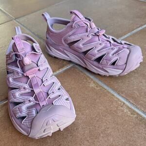 Hoka Hopara sandals in good condition. There is some light dirt around the edges but everything is intact with no worn spots or tears, and the shoes look fresh. The soles don't show any significant wear. I'm not sure what this color way is called but it's a lavender rose, or mauve.