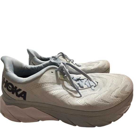 Hoka Arahi 6 shoes, women’s size 10.5B, running shoes with stability. Light gray with blue accents.