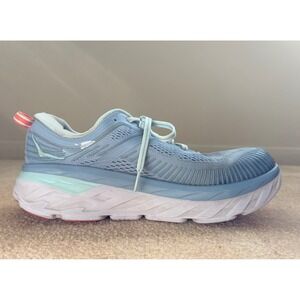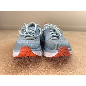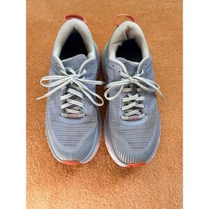 Keywords: Hoka One One, Bondi 7, Running Shoes, Athletic Shoes, Womens Shoes, Wide Width, Comfort Shoes, Walking Shoes, Blue Running Shoes, Orange Accents, Size 8.5, Cushioned Shoes, Road Running, Performance Shoes