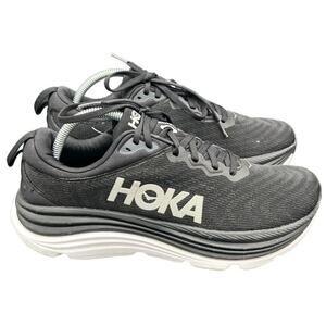 Premium Hoka Gaviota 5 sneakers offering plush cushioning and arch support. Sleek black knit upper with bold white logo and thick shock-absorbing sole. Designed for running, walking, or all-day comfort.