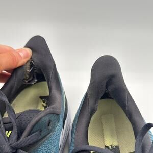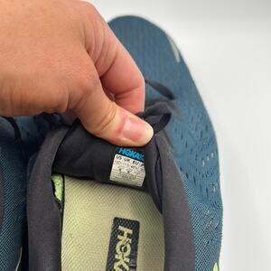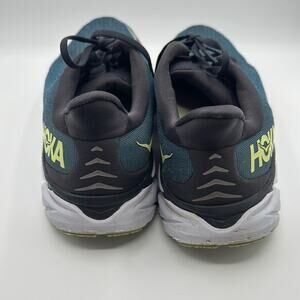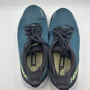 Gently Used Hoka One One Clifton 8 Running Shoes. These are a men's 12D. Blue / green color with white soles. Light green accents for Hoka logos and text. Some wear to the soles. Overall in great shape with plenty of life left!