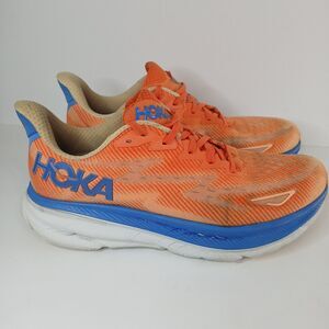 Hoka One One Shoes Mens Size 11.5 D Clifton 9 Vibrant Orange Impala Knit Running