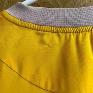 It features a water-repellent and stretchy fabric, ensuring a comfortable and secure fit during running and jogging activities. The golden yellow color and solid pattern add a touch of style to any activewear outfit. This top is machine washable with a medium fabric wash.
