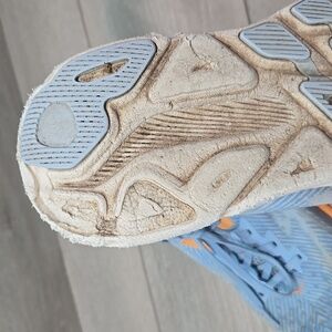 Lightweight and breathable design. Perfect for running and workouts. Stylish light blue with orange accents.
