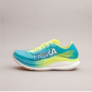 Hoka Rocket X 2 carbon plated running shoes. Size 7 women’s. I have these in both a 7 and a 7.5 and like them both. I’m a true 7 in all shoes. Teal / yellow color. Great carbon plated shoes!