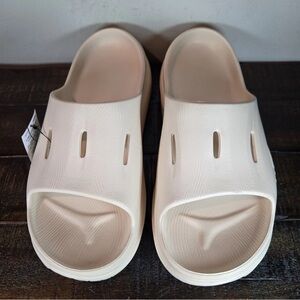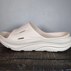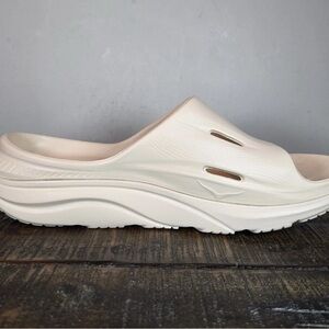 Comfortable Hoka Ora Recovery Slides in a sleek cream color. Perfect for post-workout relaxation. Brand new with tags!