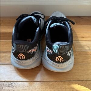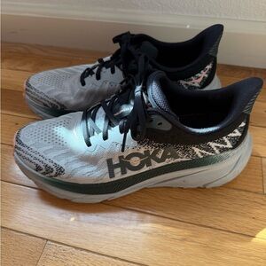 Hoka shoes with a dynamic black, gray, and white pattern. Ideal for running.