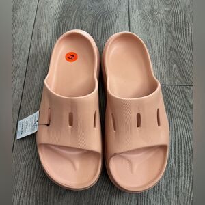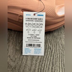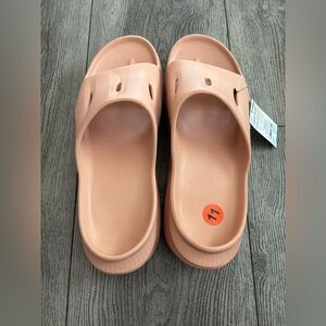 Hoka slides in a soothing sandstone color. Ideal for post-activity comfort.