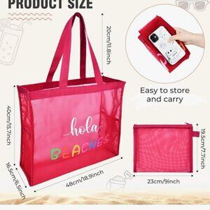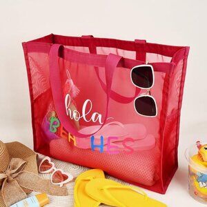 Turn heads at the beach with this large, foldable mesh tote featuring a bold "Hola Beaches" print. With roomy dimensions, two convenient pockets, and a matching pouch, it keeps your essentials organized and sand-free. Perfect for travel, pool days, or sunny getaways.