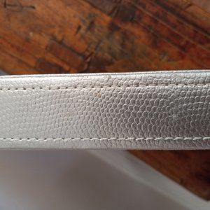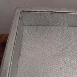 Purchased from Hold Everything's NYC location in 2005. Hold Everything was a division of Williams Sonoma and closed its retail locations in 2006. Silver leather-wrapped tray with a snake skin embossed pattern. Can be displayed on a table or counter, and is slim enough to be placed in a drawer. Great for holding keys, watches, jewelry and other small items. Measures approximately 7"x 5.25" x 2". There is some staining and wear -- mostly to the inside and edges -- but still very usable.