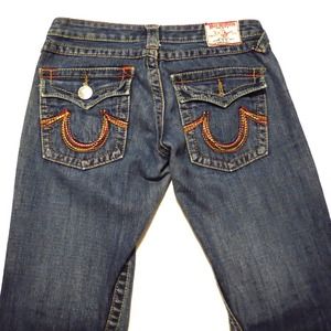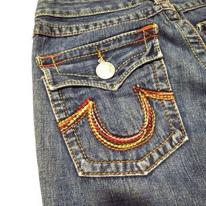 True religion medium wash jeans. Signature logo stamped hardware in silver. Horseshoe pockets. Rainbow Joey style. Flared leg with signature twist leg stitch. Classic pop of orange stitching. Five pocket design. Made in the USA. Front rise is 7" and inseam is approx 31". 100% cotton. One silver button from the back is missing.