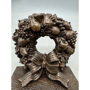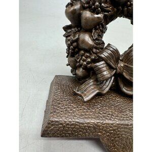This cast iron wreath stocking holder boasts a bronze-like finish, intricately detailed with fruits and a bow. Sturdy yet elegant, it adds a touch of sophistication to holiday decor while securely holding stockings.