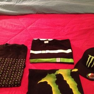 All brand new from monster promotion. Includes 3 black t shirts with different monster brand designs. Shown together and separately. Sz men's M. Fits like a ladies L. Also includes one black hat. Flex fit sz L/XL