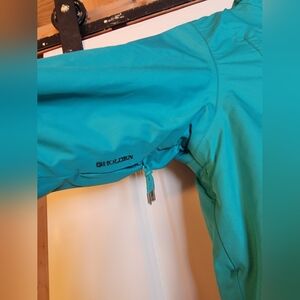Stylish teal jacket with button accents. Features a front zipper and ventilation.