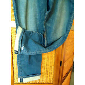 From Anthropologie, Holding Horses distressed boyfriend jeans. It's the many details that make these jeans stand out. Pewter buttons on the waistband and stitching on the pocket and fly add to the many details. Straight-cropped leg, light to medium wash, and distressed for a stylish and worn-in look. Made of Cotton & 2% Spandex Measurements: Waist 36", Rise 11", Inseam 24.5", Leg Opening 7.5" across.
