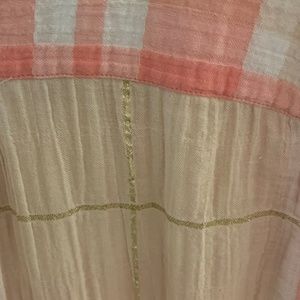 Pink plaid blouse with tiny buttons and metallic stripes. 98% cotton. Size tag missing. Appears to be size medium.