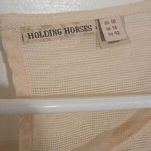 This elegant cream sundress by holding horses is perfect for summer, featuring a scoop neckline and charming 3/4 flutter sleeves. Its flowing silhouette and delicate design make it an ideal choice for cocktail occasions, offering both style and comfort.