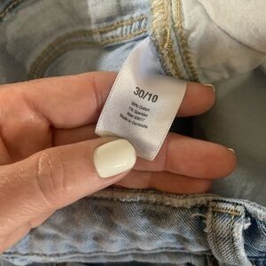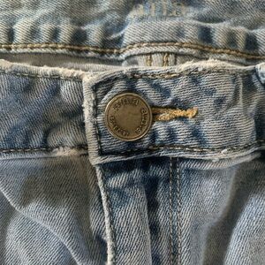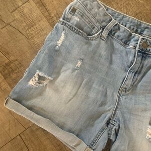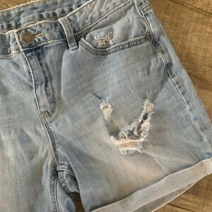 Holy distressed blue jean shorts with cuffed bottoms. Holes do expose skin as the photos indicate.