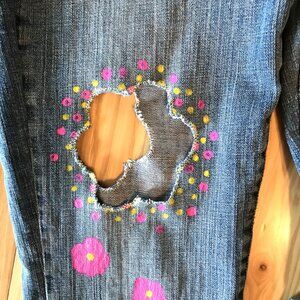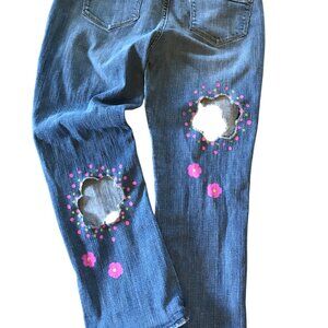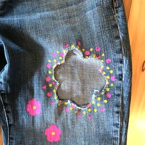 Holey distressed jeans with flower cutouts, trending destroyed ripped cut out denim jeans. This is a comfortable-looking pair of jeans that have been upcycled and reworked by cutting flower-shaped holes in both front and back, reinforcing, and embellishing with acrylic paint in the form of pink flowers -- would be a unique, trendy gift for any teen or young woman!
