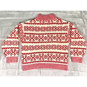 Holiday Après Ski Sweater Womens L New Day Red Cream Sparkle Fair Isle Chunky Thick Winter Christmas Party. Festive candy cane colors. Ski resort fireplace. Sustainable recycled fibers.