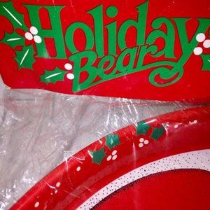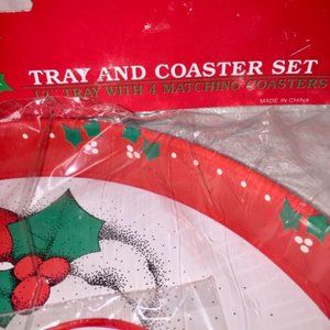 Holiday Bear 12" metal tray with 4 matching round coasters. New in package. Polar bear with red and white striped scarf wearing a Santa hat. Presents. Please see photos for details.