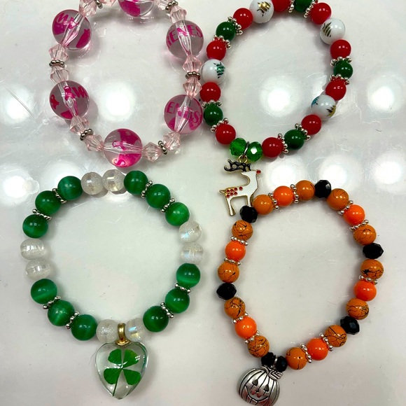 4 different holiday bracelets. They are for breast cancer awareness month, Christmas, st Patrick’s day, and Halloween
