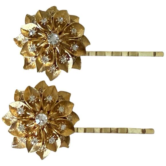 A shimmering set of gold floral bobby pins designed with layered vintage-inspired petals and sparkling crystal centers. Each piece captures a warm, romantic glow—perfect for bridal hair, holiday events, bridesmaids, or adding a touch of antique charm to your everyday styling. These pins tuck beautifully into buns, braids, and half-up hairstyles, offering a delicate yet standout flourish.
