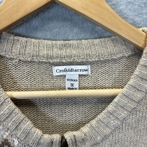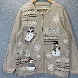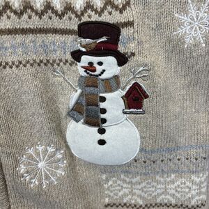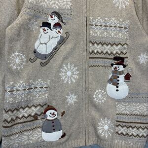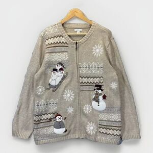 Holiday Cardigan 1X Full Zip Sweater Beige Embroidered Snowman Silk/Ramie/Nylon