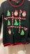 Black sweater with snowman and festive flashing Christmas trees. Features candy cane design down sleeves. Perfect for holiday gatherings and work parties.