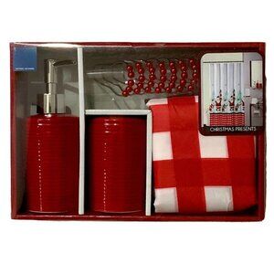 Holly Homes Santa Presents Christmas Bathroom Ensemble Set. Red White Buffalo Gingham Plaid Border. 15 Pieces