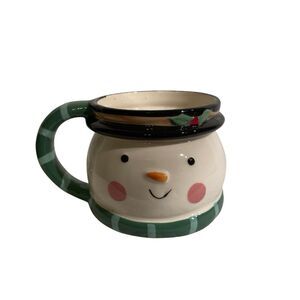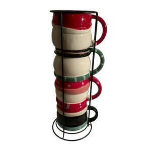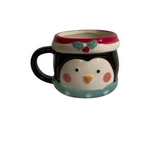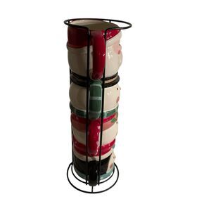 5 piece set of holiday-themed ceramic mugs featuring a penguin, Santa Claus, and two snowmen. The mugs come with a stackable stand for easy storage during the holiday season. Each mug is decorated with a different design, making it a festive addition to any holiday celebration. Made from ceramic, these mugs are durable and perfect for enjoying hot beverages while spreading holiday cheer. Holds 8 ounces. One mug has a couple of small chips underneath but doesnt affect the mugs use. Item 862