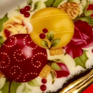 The pattern is “Holiday” by Royal Albert. (Holiday is the pattern name), New-Mint Condition. Description: Size: 10 3/8” with Ornaments of Burgundy and Gold Colored. Close-up pictures of the ornaments are #4. Picture #6 is the Royal Albert’s Old Country Roses “Holiday” 2006 date on the back of. the China plates.They were manufactured in 2006 through 2007 then discontinued. Photo #7 is for price comparison only. They mix wonderfully with the original Old Country Roses China. They are adorned with Pine Cones, Red Berries. and ribbed edges trimmed 22kt gold.. Please look at all the photos, they are part of the description. This beautiful Christmas pattern is very rare and very hard to find. I am selling them in lots of 4 plates each. They come from a Smoke free and Pet free home. This beautiful china would make a great gift for someone special or buy them for yourself! FANTASTIC PRICE! . $140.00 .I have 2 sets. I have listed then in lots of 4 dinner plates. The pictures don’t show you the beauty of the brilliant luster they have. I will gladly bundle if you want both sets. . Thanks