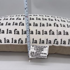 Christmas themed decorative pillow, words "fa la la" written on pillow.