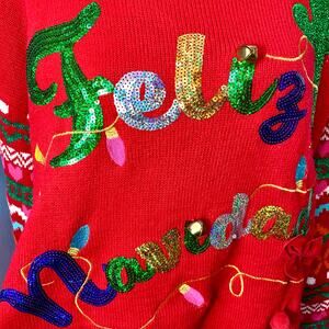 A festive holiday sweater! "Feliz Navidad" in colorful sequins with embroidered Christmas lights, a cactus and other decorations like pom poms! Perfect for the holidays and parties! In excellent used condition
