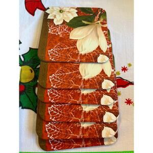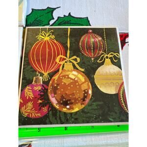 A lot of holiday coasters three are ornament themed tiles with felt on bottom to prevent scraping approximately 4 inches wide. Six matching coasters, red and floral approximately 4 inches wide, but made of cardboard, unused. Please refer to photos for current condition.