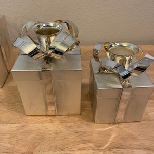 Three present boxes candle holders great for any decor. Set includes 3 1/4", 2 3/4", 2 1/4" high trio. Comes in original box for storage.