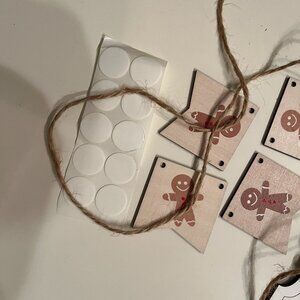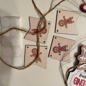 This is holiday tabletop Christmas decor that focuses on baking and cookies. Some of the decor has holes and there is some string so I assuming you can tie them around some bags of holiday treats.
