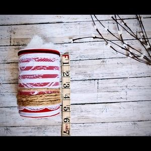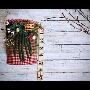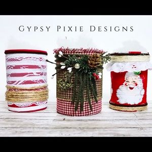 Three Upcycled Tin Cans and a Christmas bow and mittens ornament