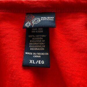 Women's Holiday Editions red, white, and blue short sleeve v-neck top, size XL. This is a stretchy pullover shirt with three accent buttons on the front, and embellished/decorated with flip flops, stars and swirls. The white is sewn in material not a second layer making it nice for warmer months. Excellent for Memorial Day, 4th of July, at the beach, and all summer. Machine washable. Excellent like new condition and from a smoke free pet free home. Quick shipper!