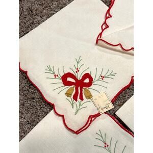 This set of vintage Christmas napkins features elegant embroidered holly and red ribbon details, complemented by scalloped edges. Durable and festive, ideal for holiday table settings.
