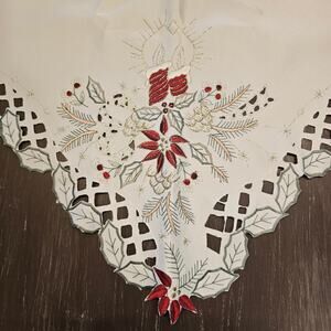 Holiday Fireplace Decor-Embroidered Poinsettias, Candles and Holly Berries 47x20. White embroidered fireplace mantle scarf with red poinsettias, green holly leaves, gold and silver candles, and a cutout border. Measures 47x20 inches. This elegant heirloom-style Christmas décor is perfect for holiday entertaining. Features classic red, green, white, silver, and gold tones. No stains or odors. Pre-owned and in excellent condition.
